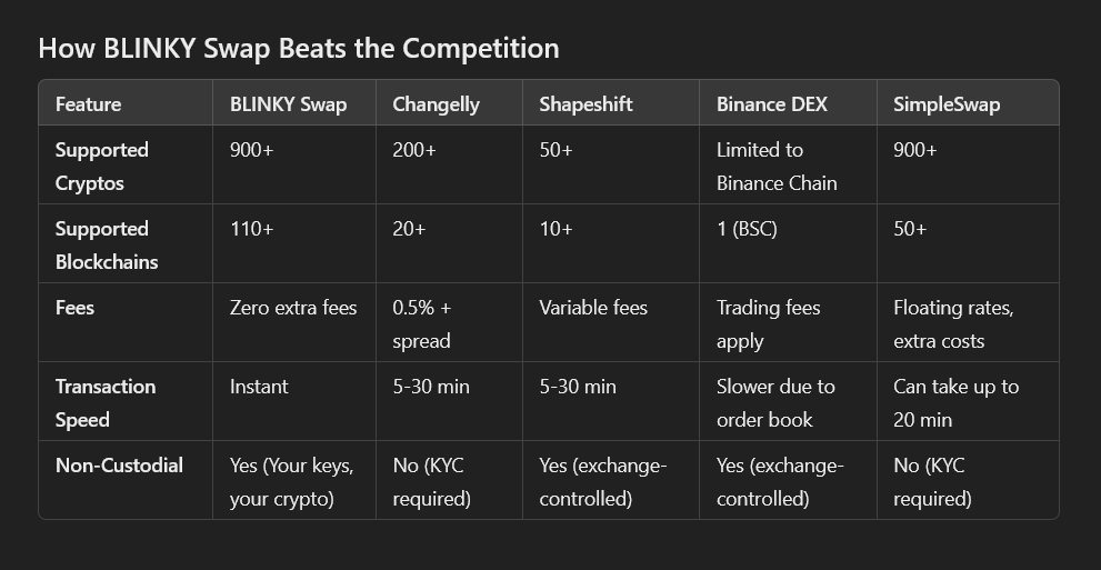 Blinky Swap offers the best cross-chain trading experience, lightning-fast transactions, and full control over your assets. Compared to other major DEXs, Blinky Swap stands out for its low fee, unmatched speed, wide blockchain support, and transparent, non-custodial service. Check out how Blinky Swap stacks up against the competition below!